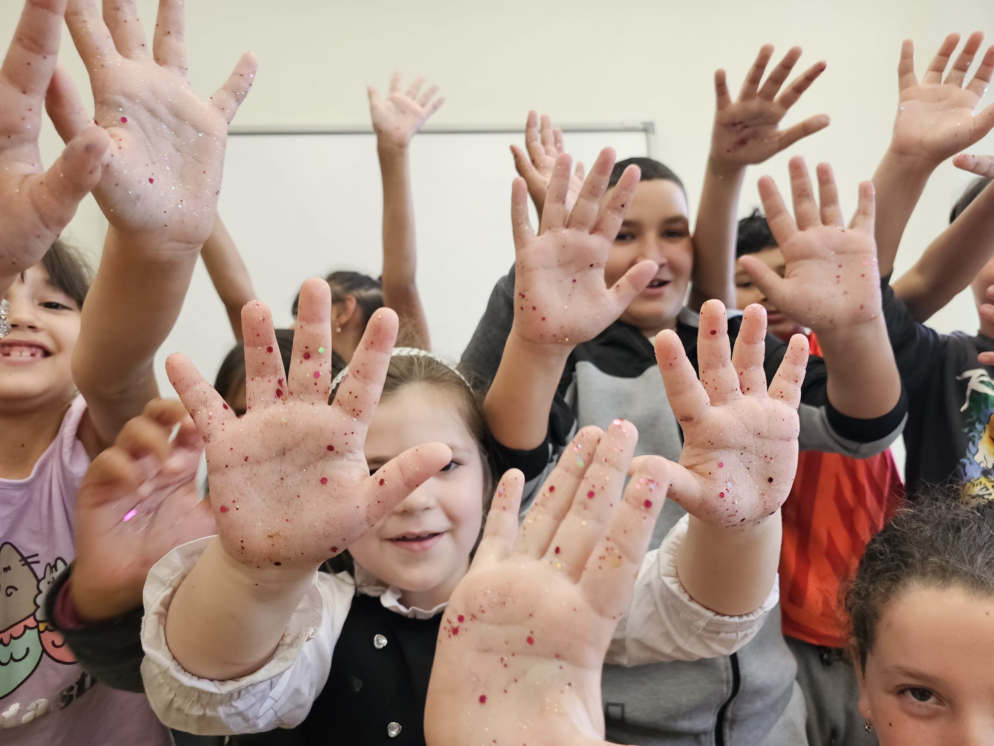 Pentru a face activitatea mai distractivă și mai ușor de înțeles, am folosit sclipici care a reprezentat „microbii” – iar copiii au putut vedea cu ochii lor cât de repede se răspândesc dacă nu ne spălăm corect pe mâini.